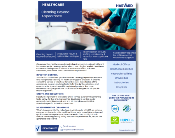 Equally as important to the quality of our service is performing cleaning tasks safely. To that end, Harvard has developed a service model approach that mitigates risk, and is in full compliance with OSHA standards specific to healthcare workers.
